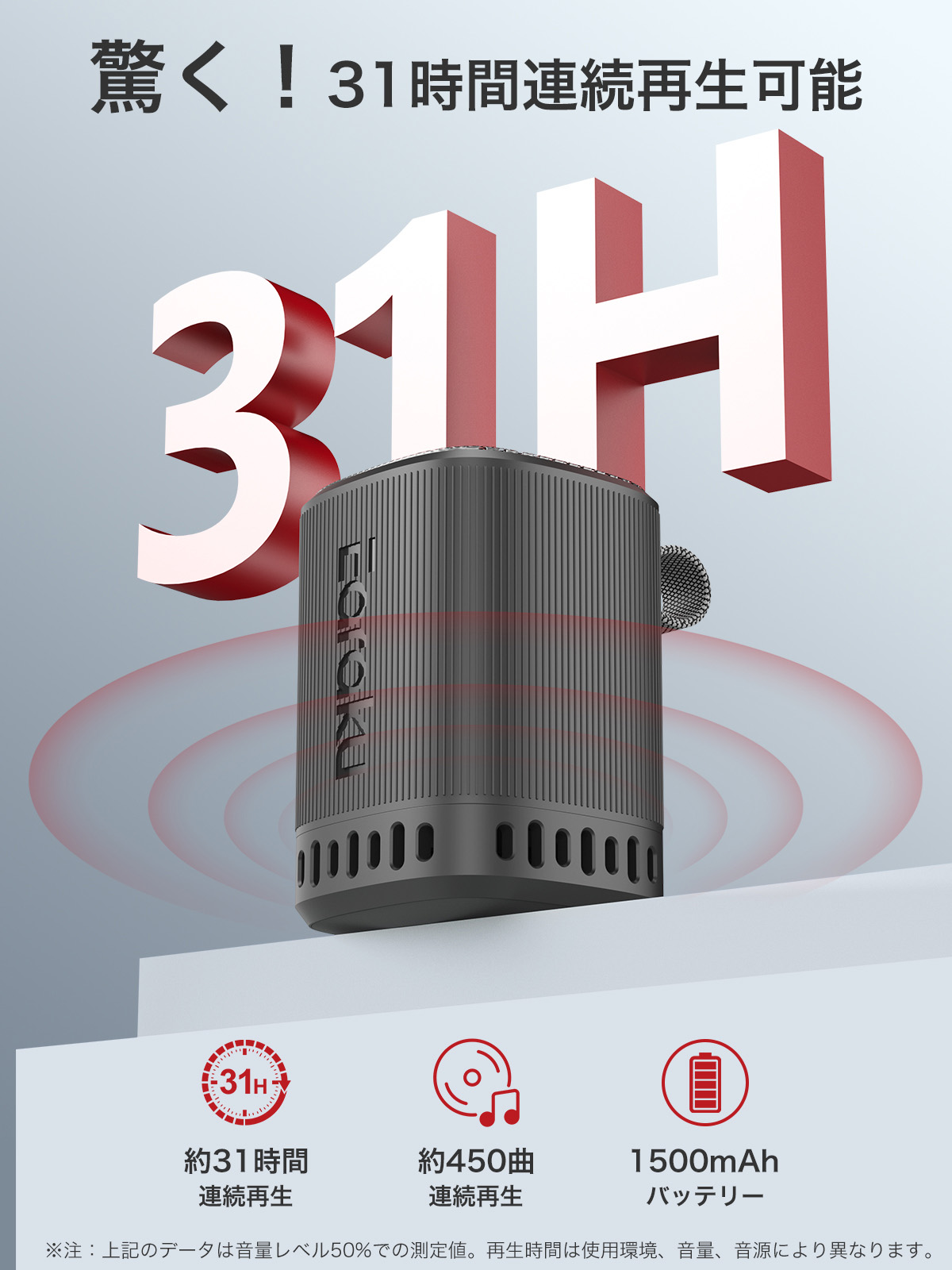 2台のスピーカーをワイヤレス接続し、立体的なサウンド体験。 - ・約31時間連続再生