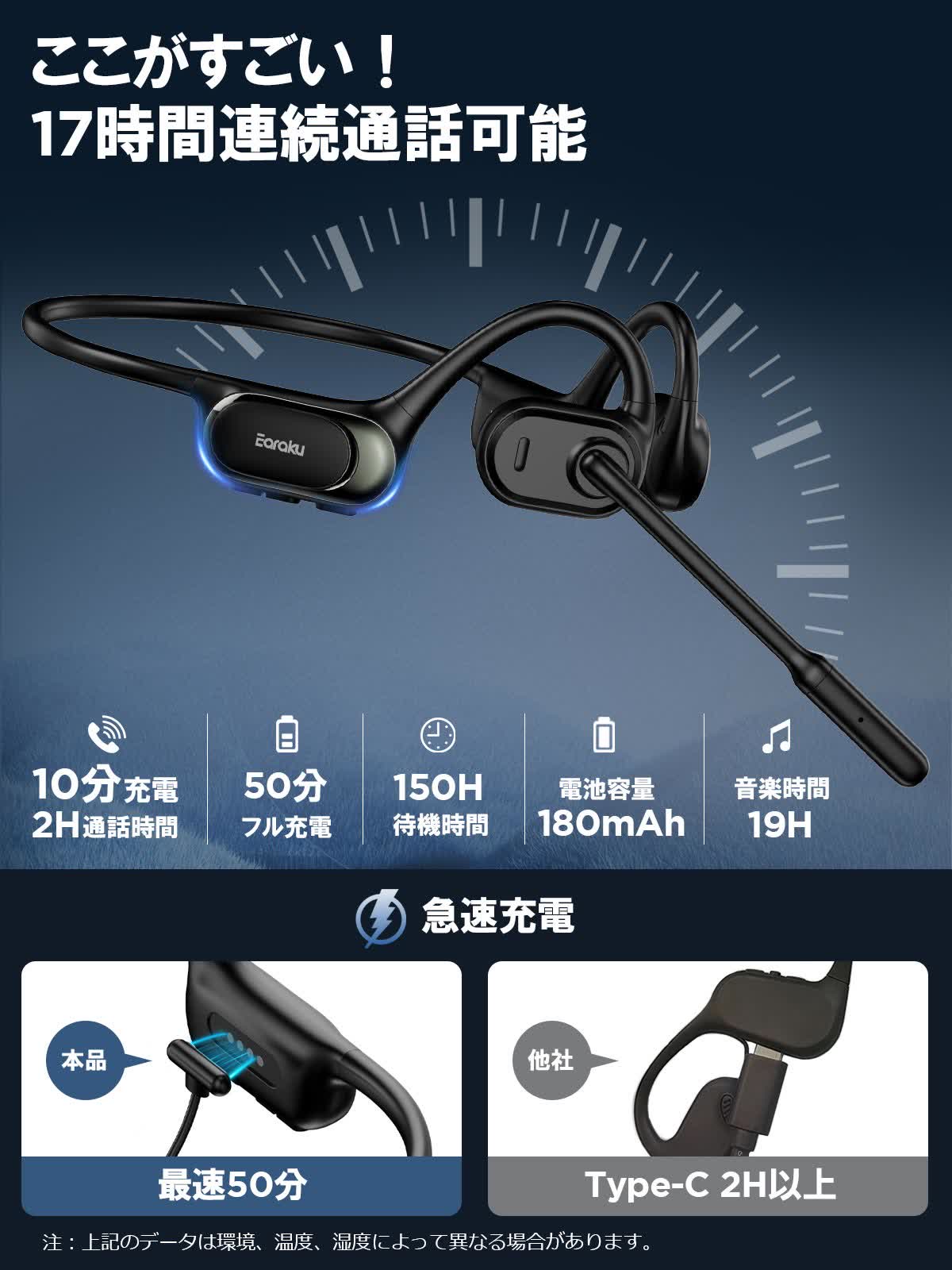- 長時間使用:通話17時間・音楽19時間の大容量バッテリー。