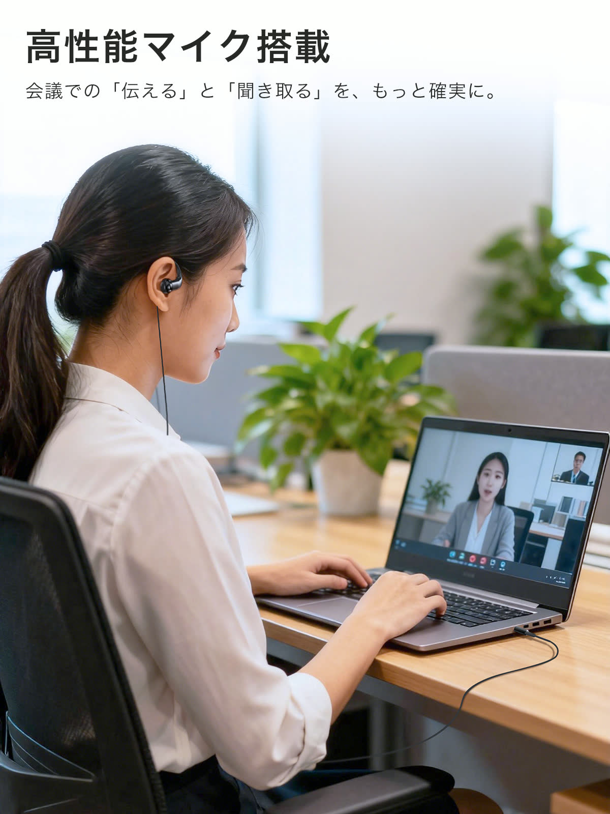 高感度マイクを搭載し、相手の声も自分の声もくっきり伝達。リモートワークやオンライン会議、通話など、さまざまなシーンで快適なコミュニケーションを実現します。 -